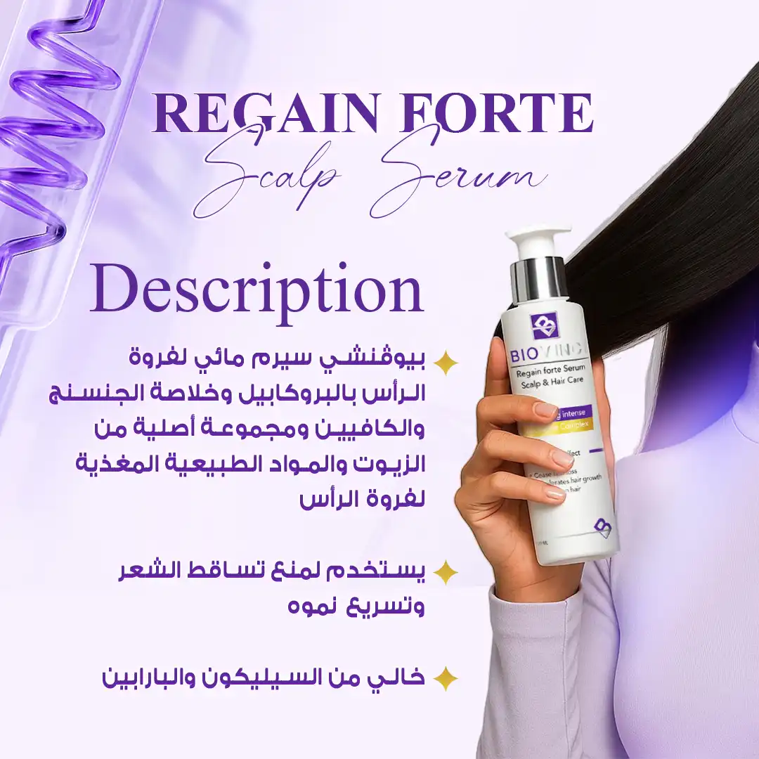 بيوڤنشي ريجين فورت سيرم هو سيرم مائي يُستخدم مباشرة على فروة الرأس لمنع تساقط الشعر وتسريع نموه بفعالية عالية وآمان تام حتى بعد التوقف عن الاستخدام. يحتوي على بروكابيل، خلاصة الجنسنج، الكافيين، ومجموعة مغذية من الزيوت والمواد الطبيعية الأصلية. خالٍ تمامًا من السيليكون والبارابين والمواد الضارة بالشعر أو فروة الرأس.